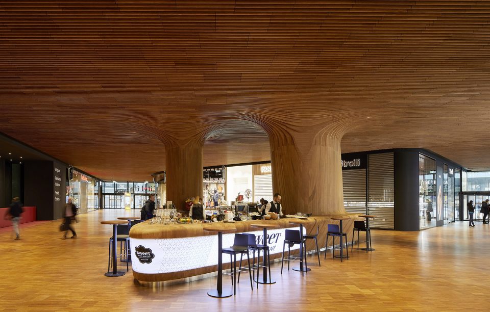 商业区域内部的设计也是颇有特色的,内部的选材考究的竹木地板,天花板和柱子无不营造出亲密欢快的氛围,精细处理过的竹子源源不断的供给于此,并展现出良好的耐用性。树脂涂层的竹木材料,由五轴CNC切割机雕琢,并用手工整理成各个装饰组件。竹木地板随支撑柱向上蔓延至天花板,柔和的曲线在空间中蔓延。在此间形成的咖啡馆,为来访者带来律动轻盈又层次分明的体验氛围。