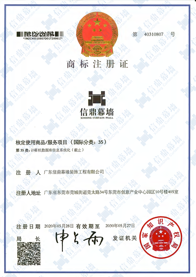 广东信鼎幕墙装饰工程有限公司自成立以来,始终高度重视企业品牌建设,努力维护商标的专用权。随着我司的知名度的扩大,为树立企业优秀形象,满足新的市场发展,我司不断地强化商标意识,为保障商标权益不受侵害,因此对“信鼎幕墙”商标申请注册。此次“信鼎幕墙”商标注册证的成功申请,标志着我司在品牌发展的道路上迈出了坚实的一步。