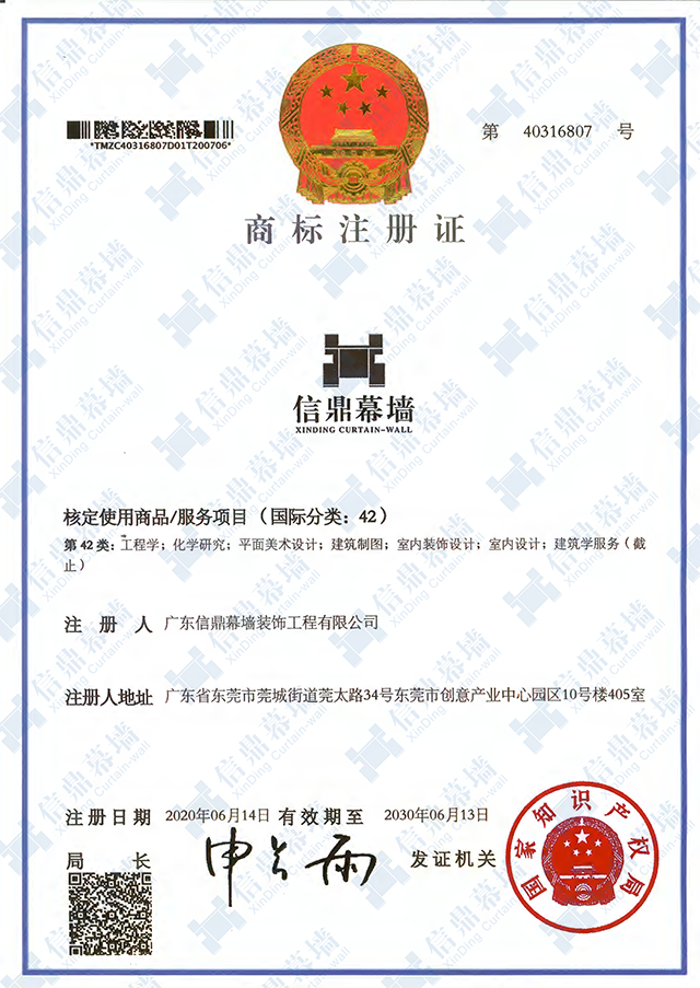 广东信鼎幕墙装饰工程有限公司自成立以来,始终高度重视企业品牌建设,努力维护商标的专用权。随着我司的知名度的扩大,为树立企业优秀形象,满足新的市场发展,我司不断地强化商标意识,为保障商标权益不受侵害,因此对“信鼎幕墙”商标申请注册。此次“信鼎幕墙”商标注册证的成功申请,标志着我司在品牌发展的道路上迈出了坚实的一步。