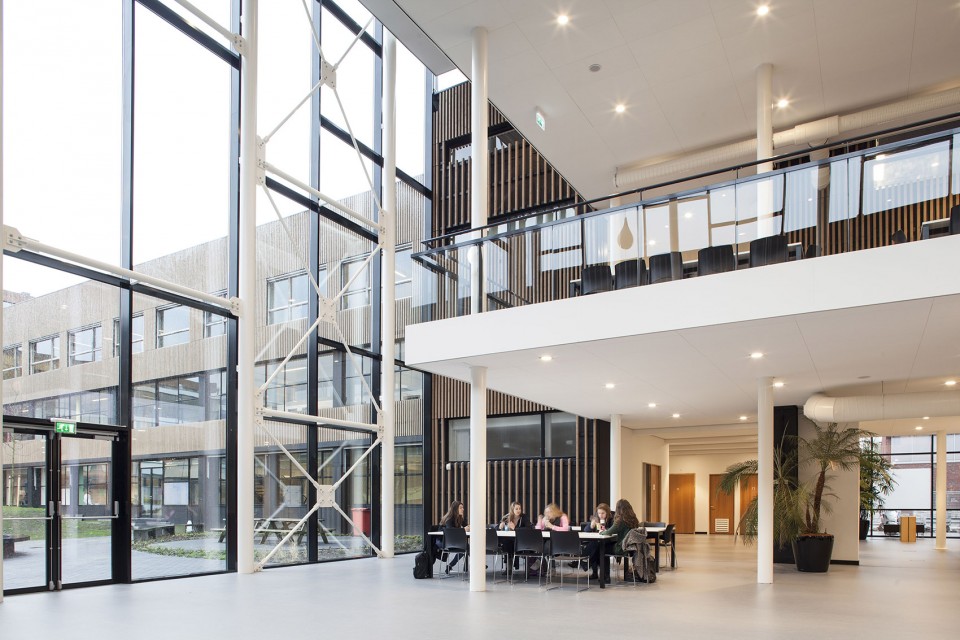 建筑中庭重点整合三个独立的区域,新的入口大厅享有大面的落地窗立面使其与周围社区建立起密不可分的视觉联系并使学校成为社区的一部分。三层高的中庭连接至建筑两翼并形成了环形人流动线取代了原有的死路,在入口大厅可观赏到中庭景观。礼堂和餐厅位于中庭的一层,图书馆和学习区悬挂于其上方。