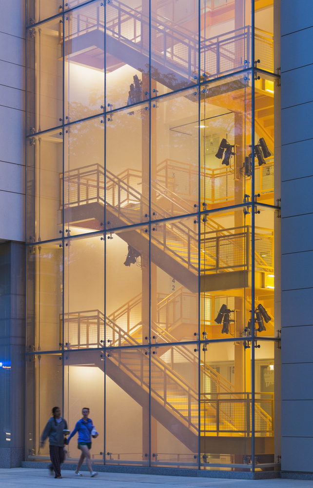 这座五层高的戏剧学院的教学楼,呈现出矩形元素组合而成的构图。在建筑拐角凸显出来,成为大学校园的标志性景观。戏剧学院的幕墙设计是十分有特色的,采用了半透明玻璃幕墙的设计,在白天阳光充足的时候,可以减少太阳光的折射,能够起到一定的遮阳作用。建筑北立面宛如戏剧学院的灯塔,在夜晚散发出柔和光亮。半透明玻璃幕墙似一帘帷幔,隐隐透射出其后一百座的可变剧场。