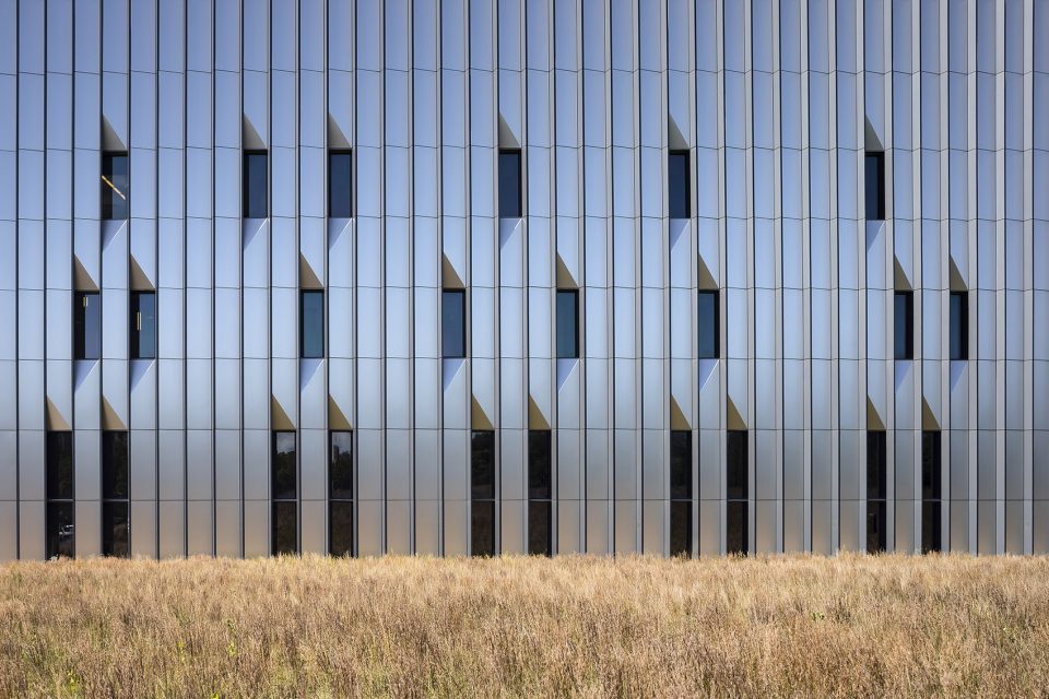建筑的基础是一圈具有雕塑感的护堤,其上种植着野草。这条护堤作为建筑的仪式性边界,同时保护、分隔了呼叫中心与周边的环境,增加了场地的美学体验。从哈钦森河或佩勒姆公园大道一侧来看,护堤隐藏了地面泊车和装卸用的杂乱空间。对于建筑的使用者来说,护堤为他们提供了一出接近自然的空间。同时这些景观中的植物均为野生的品种,不需要灌溉,满足可持续发展设计的要求。