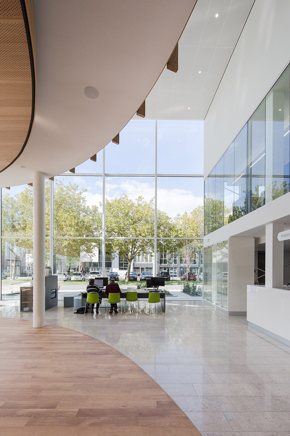 纵览办公楼的玻璃幕墙外观,显得即专业又具吸引力。公共中心和行政中心的室内颜色同样选用当地的代表色。该城市中的各种经典生活场景被打印成照片,以照片墙的形式出现在各个空间之中,从而来提升政府的整体形象。这两栋建筑均为环保建筑,通过现代技术和设备对耗能进行控制,如三层玻璃,LED灯,智能的灯光和通风装置等。