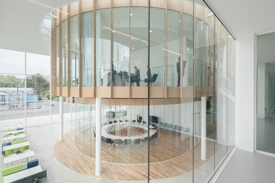 不但是玻璃幕墙为建筑物增加了开阔的视野,而办公楼的内部空间是宽敞的,引人入胜的。建筑包括两个高的、明亮的通用办公区以及一位介于二者之间的绿色中庭。中庭与入口保持在一条直线上,形成良好的视觉效果,并设有接待处和餐厅。