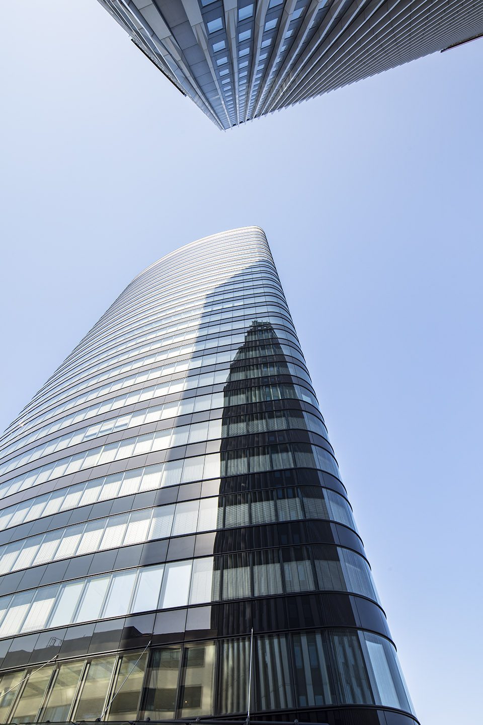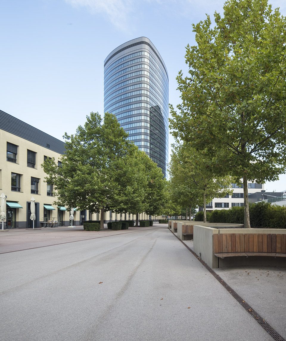 大楼的造型十分简洁,但在水平截面上有着动态的流线,以及光滑圆润的表面。建筑的空气动力源于融入空间的曲线,其横向结构与旁边高速公路的曲线剖面形成了对话。大楼与相邻建筑的透明结构形成了对照,其设计元素调和了项目与基础交通设施之间的关系。建筑的双层环状立面提供了可移动的外部挡风和遮阳结构。