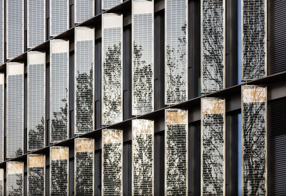市政厅整座建筑呈圆柱形立体设计,其幕墙设计也是根据建筑立面的形状设计成曲面的。市政厅是采用玻璃幕墙的设计,在玻璃幕墙的外立面使用以纵向排布的、具有高隔热性能的光伏板模块构成,立面上的光伏板能够产生建筑运行所需的能源。玻璃幕墙有一个缺点是遮阳性有所欠缺的,而光伏板一方面可以减少太阳直射时,对市政厅内部产生的光污染,另一方面,光伏板能够吸收太阳能,将太阳能转化为电能为建筑物提供日常所需要的能源。市政厅建筑是世界上第一座“能源盈余”的公共建筑,其每年生产的能量要多于自身消耗的能量;多出来的能量会被用于城市的电网系统。