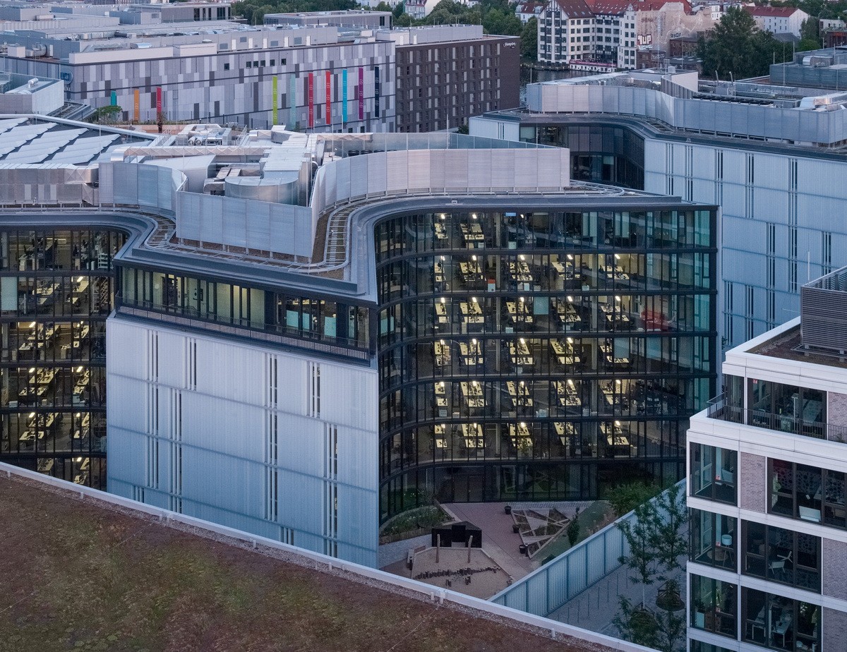 国外办公室建筑有很多是别具特色的,由两栋建筑组合而成,它们位于该公司在柏林新园区的核心,七层建筑的设计,使之囊括了总量为43000平方米的办公空间。相较于形成一个封闭的街区,该建筑在城市中以一种开放和透明的状态呈现,创造出一种引人注目的表达方式,并与该公司的身份特征相匹配。围裹式的建筑幕墙像方括号一样包裹着精心雕琢的建筑体量,并成为了设计的基础部分。通过将建筑布局以对角线的方式旋转,从而面向城市发展计划,创造出了对于传统柏林街区的重新解读。正是这种解读,使得面向城市展开的建筑设计方法能够被发掘出来。