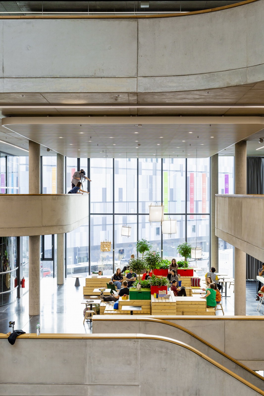 公共区域是集中的,为了鼓励员工之间相遇的机会和不同部门之间的互动。交流是积极存在的。此外,像林荫大道一样,邀请人们进行交流的交通区域被创造出来。城市栈道的两侧通常会有休憩和汇聚点。每层楼还有会议室盒子,用于自发的会见和已经计划好的合作。