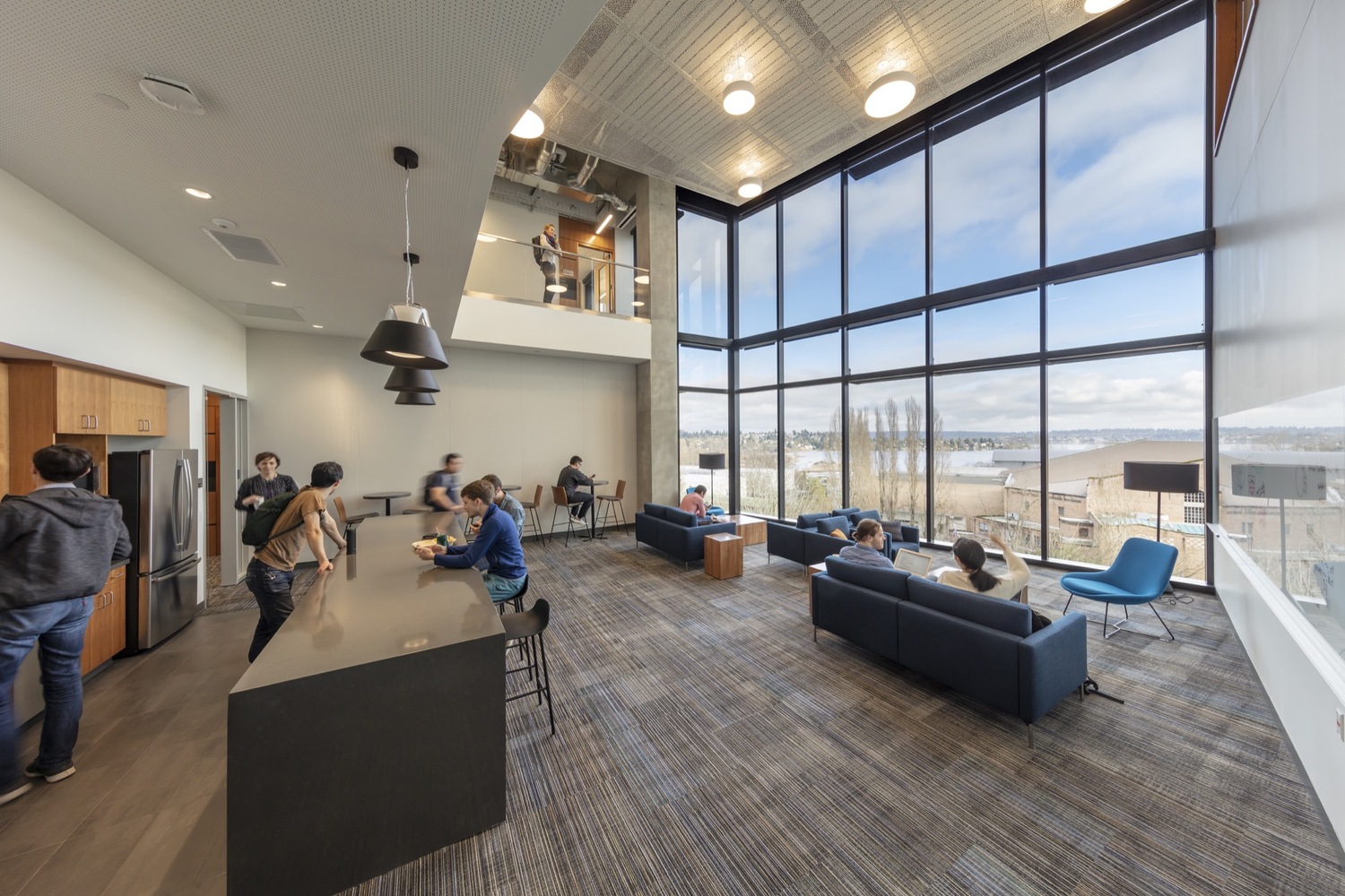 屋顶活动中心将服务于各类教学需求、行业合作和户外展览,人们能尽情享受来自校园、华盛顿湖和远处的喀斯喀特山脉的风光。在一个被工程系建筑包围的密集校园区内,扩建场地充分考虑了史蒂文斯路的现有设施。这是一条允许汽车、公共汽车、行人和自行车共享的校园主路,因此需要一个整体性方法来整合校园流线与建筑项目。一条人行道路穿过树木林立的陡坡,与史蒂文斯路以及两条通向伯克-吉尔曼步道的服务性道路相交,形成了一条连接校园中心德鲁姆赫尔喷泉和校园东部体育设施的重要轴线。
