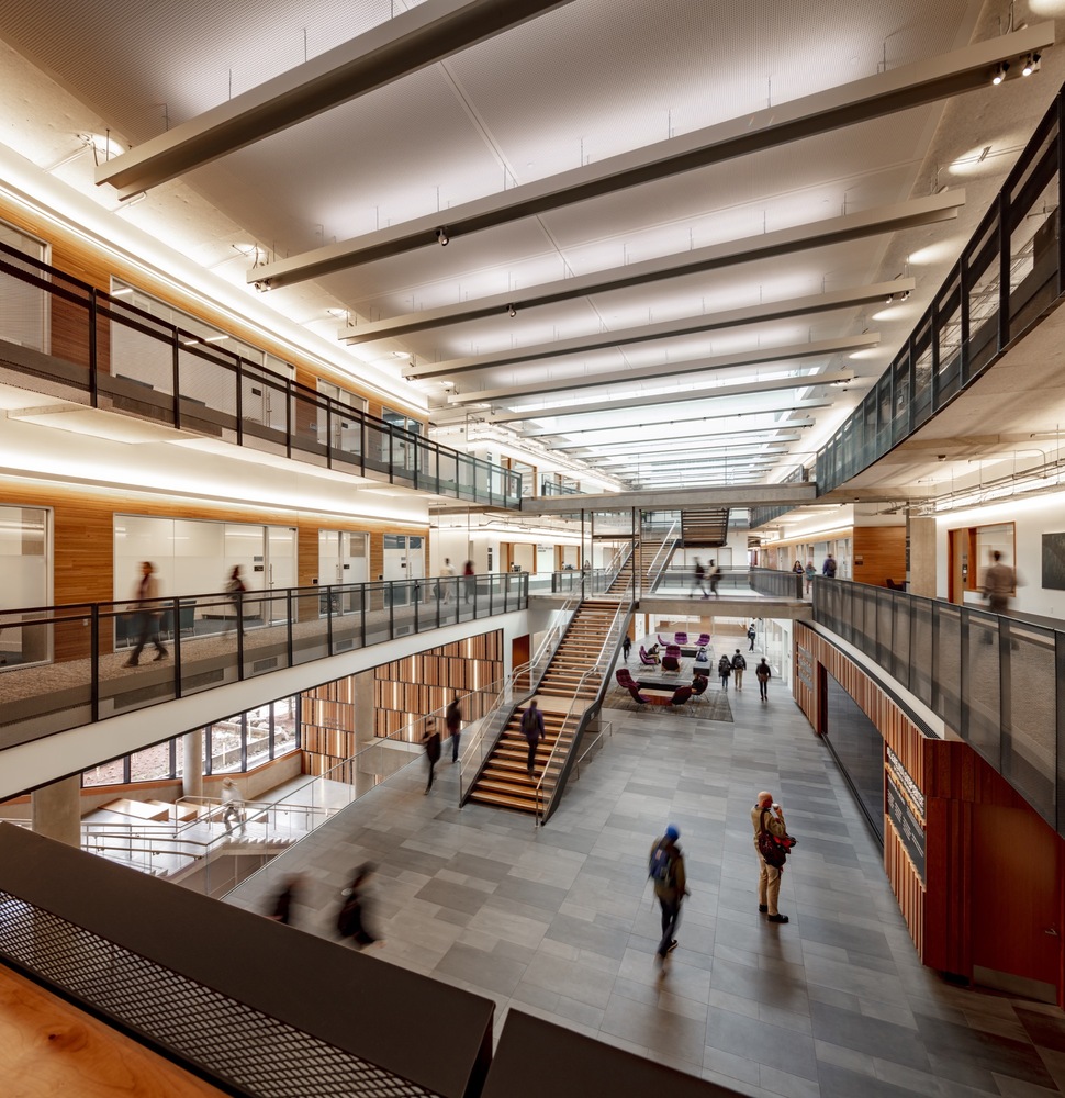 该项目是位于一所学院内的教学中心,大大扩展了学院的现有能力,提供了重要研究空间、教室、演讲厅、教职员工办公室,并为本科生建立了一个新家。建筑的中心是一个大型中庭,从视觉与物理上连接了所有楼层,如同学院的文化中心。在这个以技术为中心的环境中,日光中庭是一个重要的社交孵化器,它可以培养学生之间的交流,鼓励团队之间的互动,并反映出该院系创新和跨学科协作的文化传统。