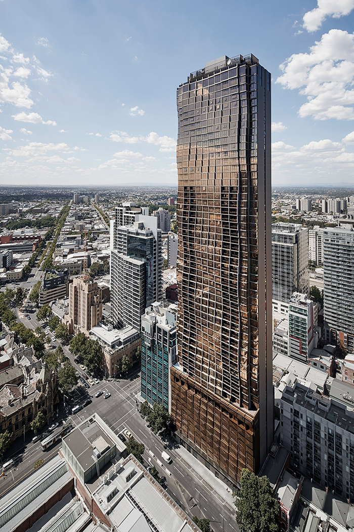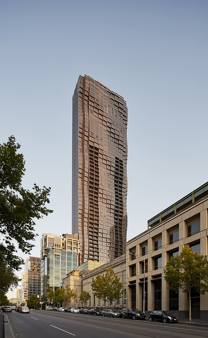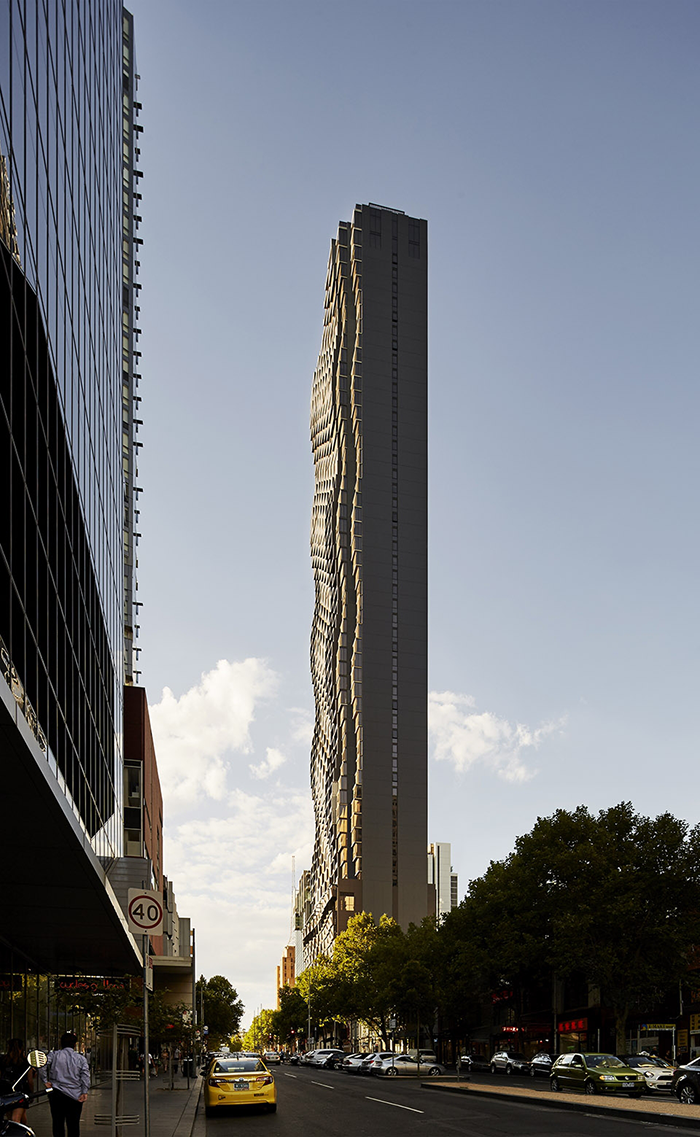 众所周知,大家都喜欢位于转角处的公寓,因为可以享有更好的自然光照和景观视野。这座拥有波浪形外立面的公寓楼位于墨尔本的CBD区域,共55层。如果仔细观察的话,就会发现立面上每一处水平和垂直的波纹都是由单独的房间组成的。这些房间略微突出建筑幕墙表面,呈现出一种随机拉开的一组抽屉的既视感。