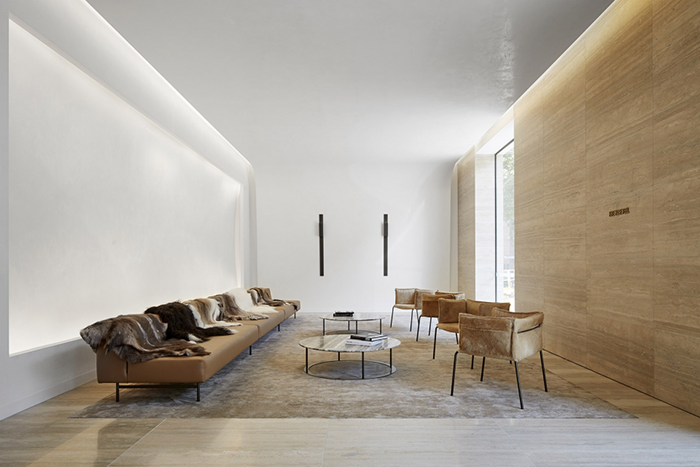 建筑下层立面细节,使用网筛状立面,公寓楼的室内空间则采用白色和银色的通用色调,配以希腊神话中特修斯和牛头怪的装饰物。这是一个经过精心设计的居住空间,银色和白色的洞石墙上雕刻着浮雕,成为一个具有指向性的空间元素。