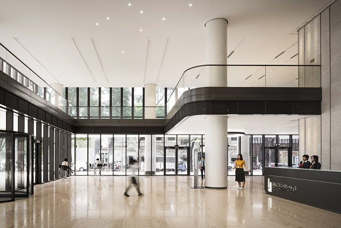 中心大堂,首层立面为落地玻璃,以柱廊的形式向街道打开,首层立面为落地玻璃,以柱廊的形式向街道打开,建筑窄边上的巨大出挑雨棚塑造了标志性的主入口,访客由此进入宽阔的大堂,交通核心筒位于大堂中央。