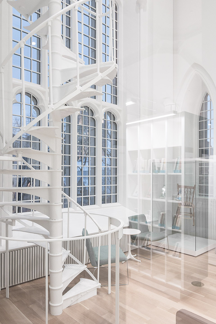 建筑内部以白色调为主,充满光线,通过雕塑般的白色旋转楼梯形成与现存教堂一样的宽阔空间,几次改造工程中精心修复的元素突出了这里丰富的社交和空间历史。空间保留的原有特征如尖拱窗户、天花板线脚与现代家具和谐地融合在一起。以自由为主题的魁北克文学作品的永久展览没有局限在一个单独的房间内,而是占据了整个教堂空间。