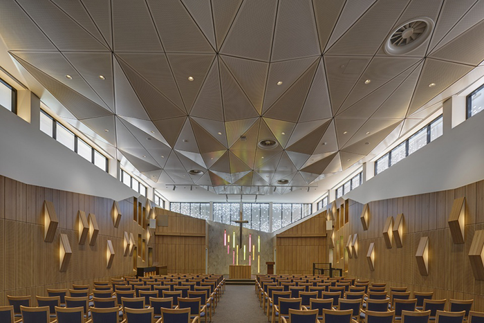 St James教堂的幕墙是以镂空的铝单板为主的,柔和的光线透过外壳的孔隙照进室内空间,营造出一种斑驳的光影效果。