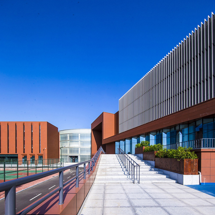 建筑幕墙不但用了陶土板这种材质,还结合了预制清水混凝土百叶板,让体育馆的幕墙更具有时尚特色之感。体育馆中间位置,采用了特殊设计的玻璃幕墙设计,这个玻璃幕墙与普通的玻璃幕墙不同,是以风琴状对玻璃幕墙进行设计的。这样的设计比平面的玻璃幕墙更具好处,风琴状的玻璃幕墙可以让光的柔和地折射进室内,减少光线直射而造成的光污染。