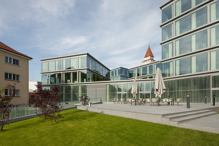 Schwabisch Media办公楼内部还设有室外活动场地,员工可以在舒适的自然环境适当地缓解工作方面的压力,重新调整 思维再投入工作状态中。也可以约上三五同事,在室外交流探讨工作,思维在相互碰撞下也许会产生新的火花。