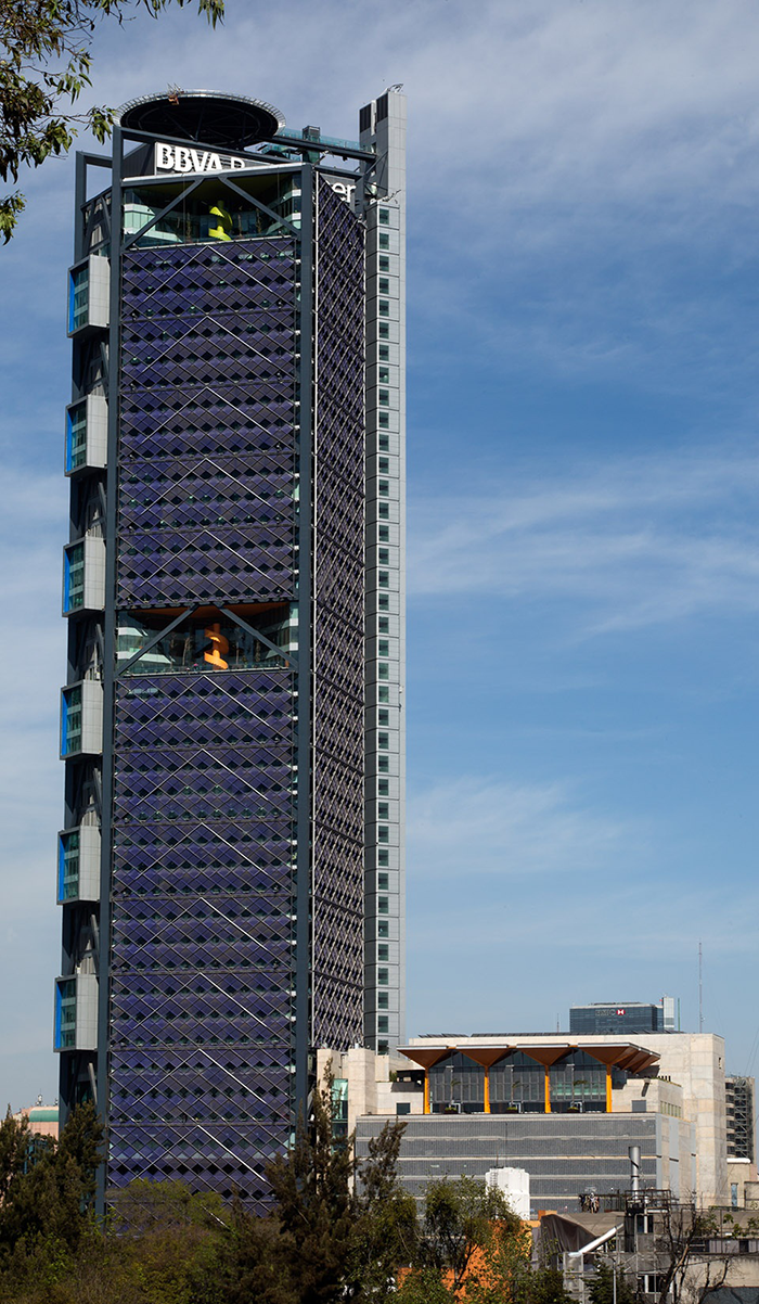 BBVA Bancomer银行总部大楼的外观设计可谓是与从不同的灵感来源于墨西哥的传统和历史建筑,有异于其它银行总部的大气、方正的建筑设计,而这座银行总部的设计是具有很大的特色与不规则形状的。建筑师使用对角线结构的几何形状创造出一种斜条格架式结构,保护了外立面免受太阳的直射,同时减少了建筑的传热。