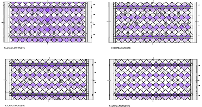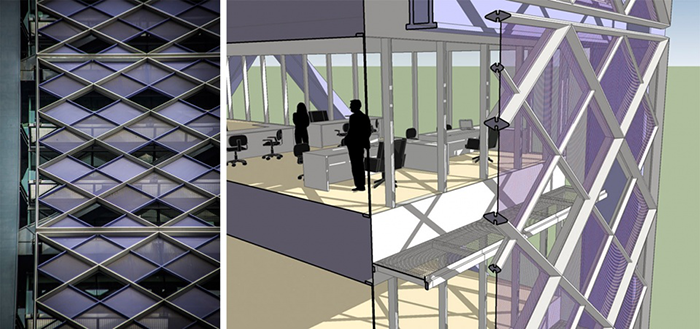 设计师在幕墙结构中,加入了一种斜条格架的金属网格结构。这种金属结构并不是为了防盗的,其实,是一种遮阳结构,遮阳结构保护了外立面免受太阳的直射,使幕墙形成一小格菱形。与传统地大块玻璃相比,可以减少玻璃对建筑物内外部所产生的光害。